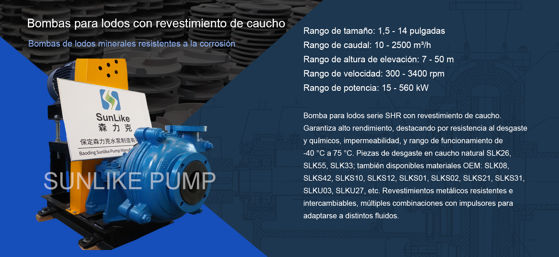 Bombas de lodos resistentes a la corrosión: Las bombas de lodos con revestimiento de caucho de la serie SHR de Sunlike Pump® se caracterizan por contar con revestimientos de caucho resistentes a la corrosión que son reemplazables. Constituyen una opción ideal para el transporte de partículas finas y lodos corrosivos que no presentan bordes afilados. Una de las principales ventajas de las bombas de lodos Sunlike es la disponibilidad de múltiples opciones de materiales, tales como caucho natural, caucho de nitrilo, poliuretano, entre otros. Esto permite fabricar la bomba utilizando los materiales más idóneos, diseñados específicamente para satisfacer los requisitos operativos de cada aplicación. Asimismo, es posible combinar el uso de estas piezas en contacto con el fluido para lograr un mejor rendimiento, reducir los costos y prolongar la vida útil del equipo.