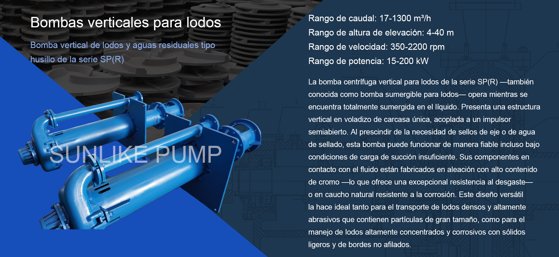 Bomba vertical para lodos de foso Sunlike Pump® SP/SPR: diseño semisumergido con sello de eje protegido, ideal para el bombeo de lodos. Esta bomba está diseñada para aplicaciones que exigen una mayor fiabilidad y durabilidad de la que pueden ofrecer las bombas de proceso verticales convencionales. Gracias a su robusto diseño en voladizo, la bomba de foso SP/SPR resulta idónea para el manejo continuo e intensivo de líquidos y lodos abrasivos y corrosivos, operando en estado semisumergido dentro de fosos o pozos de recolección.